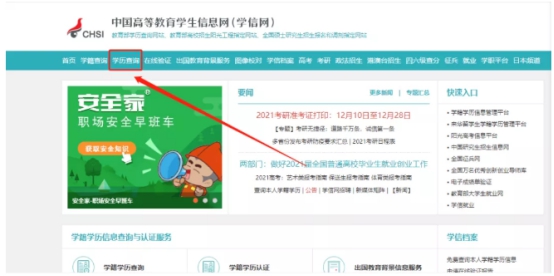 第一步:登录【学信网】网站:http://www.chsi.com.cn。点击官网首页导航栏【学历查询】
