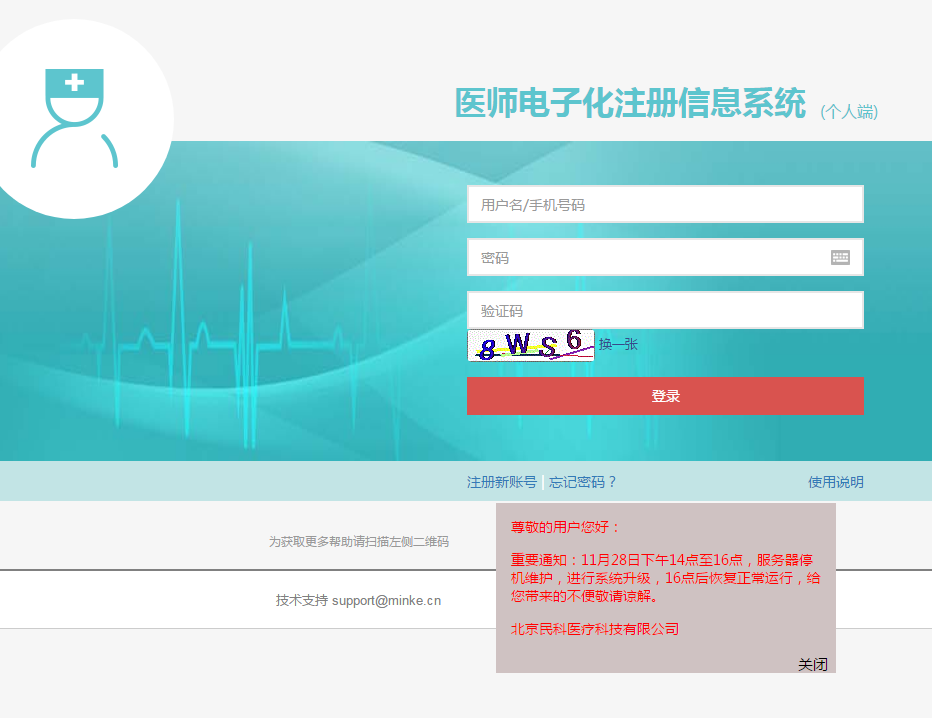 在11.28日下午14点至16点,由于系统维护,医师电子化注册个人端暂时无法办理业务。大家可以错开此时间段办理业务。下午16:00后恢复正常即可办理。