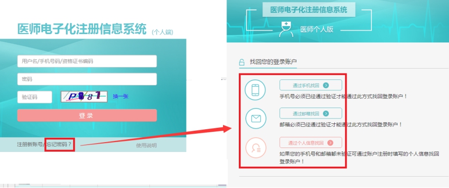 忘记密码,您可以通过医师个人端“密码找回”功能申请找回。