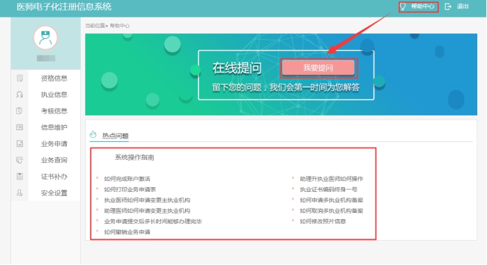 医师个人如果在使用系统时遇到了问题,请点击右上角“帮助中心”,首先查看下方热点问题,如果还不能解决问题,您可以点击“我要提问”,将问题描述清楚后提交。