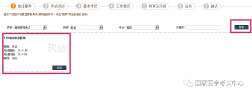 选择需要报考的项目,我们以医师资格考试中西医执业助理医师为例,在下方的类别中,选择医师资格考试,级别选择执业,专业选择中医,然后点击搜索,下方将显示考试项目,确认是自己报名的考试项目后,点击报名按钮。