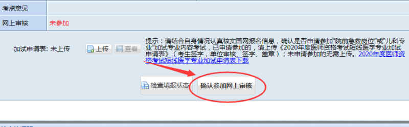 (二)完善省网信息。进入省网,完整填写试用期考核合格证明、学历证明、助理医师资格情况和实践技能缴费(免考考生可不缴费,仅针对2019年参加湖北考区临床类别实践技能考试通过的考生,即210和110类别)等相关信息后,方可进行“确认参加网上审核”环节。请仔细阅读《考生承诺书》和《考区告知》后,再点击“是”完成网上现场审核环节,点击“否”则无法完成参加网上审核,视为放弃考试报名资格。