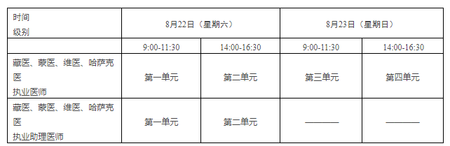 考试实行计算机化考试,军队现役人员文职人员加试军事医学,院前急救岗位和儿科专业加试相应内容。中医类别藏医、蒙医、维医、哈萨克医专业实行纸笔考试。统一考试时间如下: