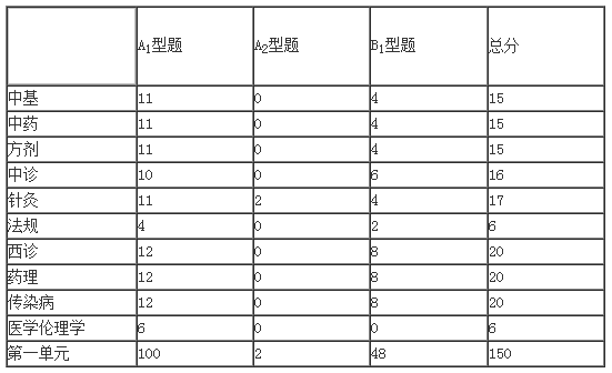第一单元:中基15分,中药15分,方剂15分,中诊16分,针灸17分,卫生法规6分,西诊20分,药理20分,传染病20分,医学伦理学6分,共150分