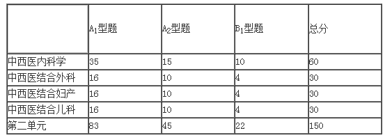 第二单元:中西医结合内科学60分,中西医结合外科学30分,中西医结合妇产科学30分,中西医结合儿科学30分,共150分
