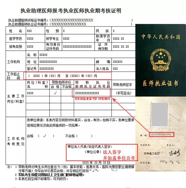 6.《医师资格考试试用期考核证明》,须试用单位法定代表人签字并加盖单位公章(医疗专用章、财务专用章等不合格,表内所有签字处均需手写签字)。