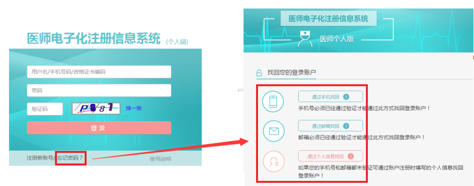 答:忘记密码,您可以通过医师个人端“密码找回”功能申请找回。