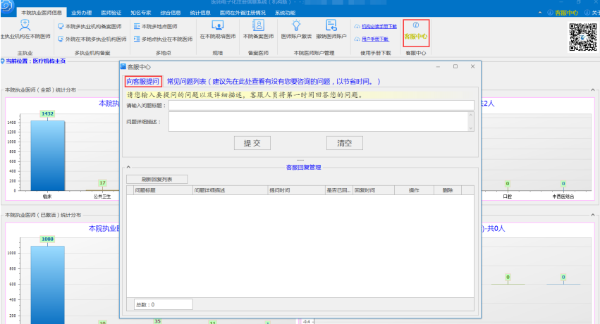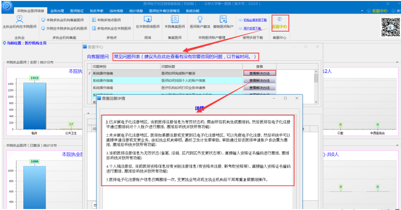 如果是医疗机构在使用系统时遇到了问题,请点击右上角“客服中心”,首先可以查看常见问题列表,看看有没有您要咨询的问题。