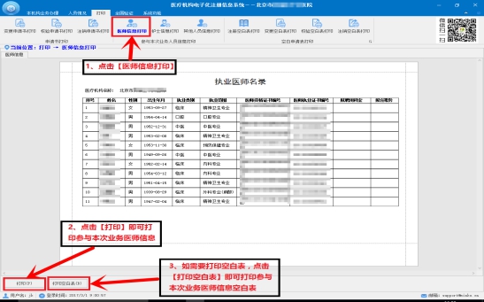 l 在图中单击【医师信息打印】按钮,进入“医师信息打印”窗口。注:点击打印空白表可以打印医师信息空白表。如图所示: