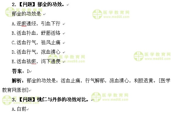 解析:桃仁的功效是:活血祛瘀,润肠通便,止咳平喘。丹参的功效是:活血调经,凉血消癥,清心除烦。[医学教育网原创]