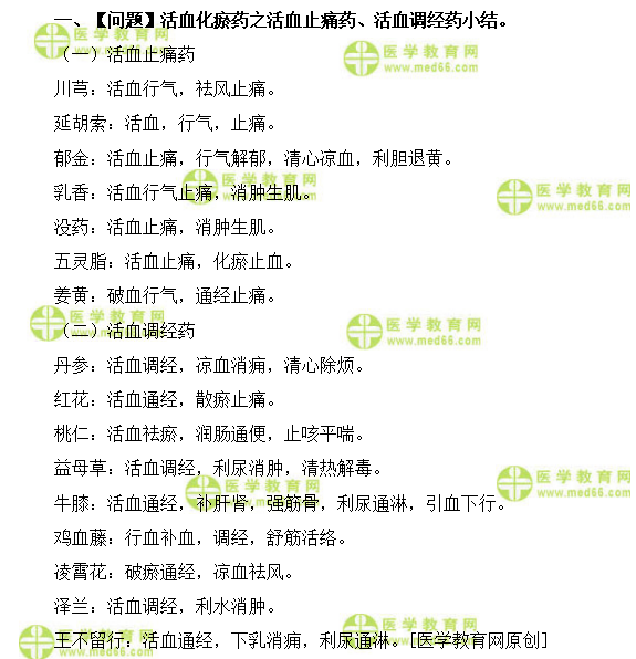一、【问题】活血化瘀药之活血止痛药、活血调经药小结。