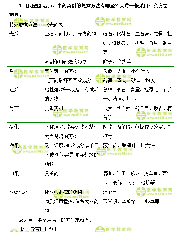 1.【问题】老师,中药汤剂的煎煮方法有哪些?大黄一般采用什么方法来煎煮?