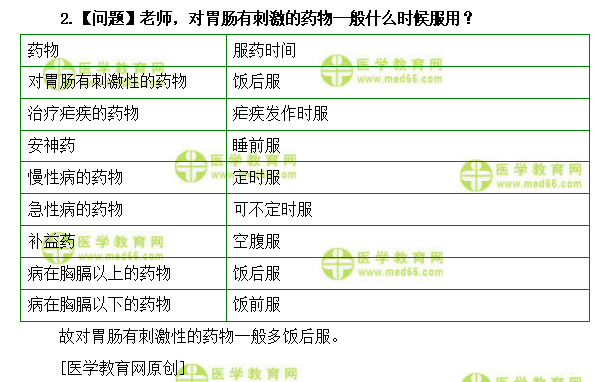 2.【问题】老师,对胃肠有刺激的药物一般什么时候服用?
