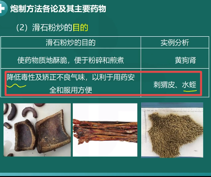 滑石粉炒目的之一:降低毒性及矫正不良气味,以利于用药安全和服用方便,如刺猬皮、水蛭等。