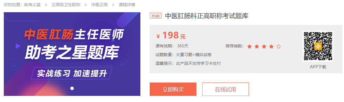 《中医肛肠科高级职称助考之星题库》系卫生系列高级职称考试题辅导软件,适用于中医肛肠科学正、副高级卫生专业技术资格考试。题库设计紧扣考试大纲、考试教材、考试科目、国家卫计委颁布的人机对话标准版。符合医学高级职称中医肛肠科考试题型与考试科目,考试资料丰富,免费试用、试题库大,软件收录专业题库高级试题,囊括了目前所有的考试题型仿真试题,并对部分难度较大试题提供专业级的解题思路、答题技巧、考试要点精解。通过人机对话的互动模式即可全面复习、又能有针对性的强化训练,提高应试能力,助您考试成功!