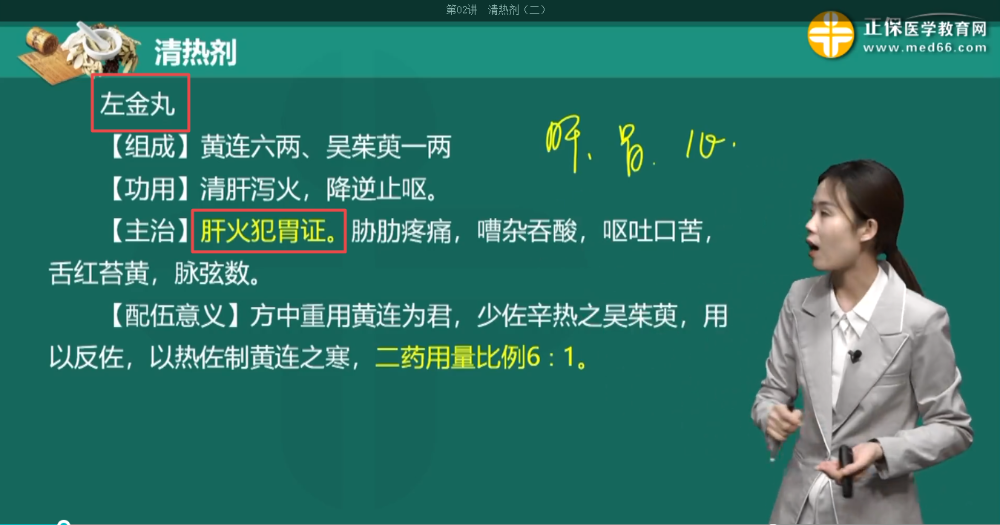 左金丸【主治】肝火犯胃证。胁肋疼痛,嘈杂吞酸,呕吐口苦,舌红苔黄,脉弦数。
