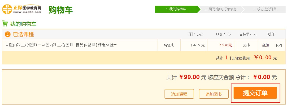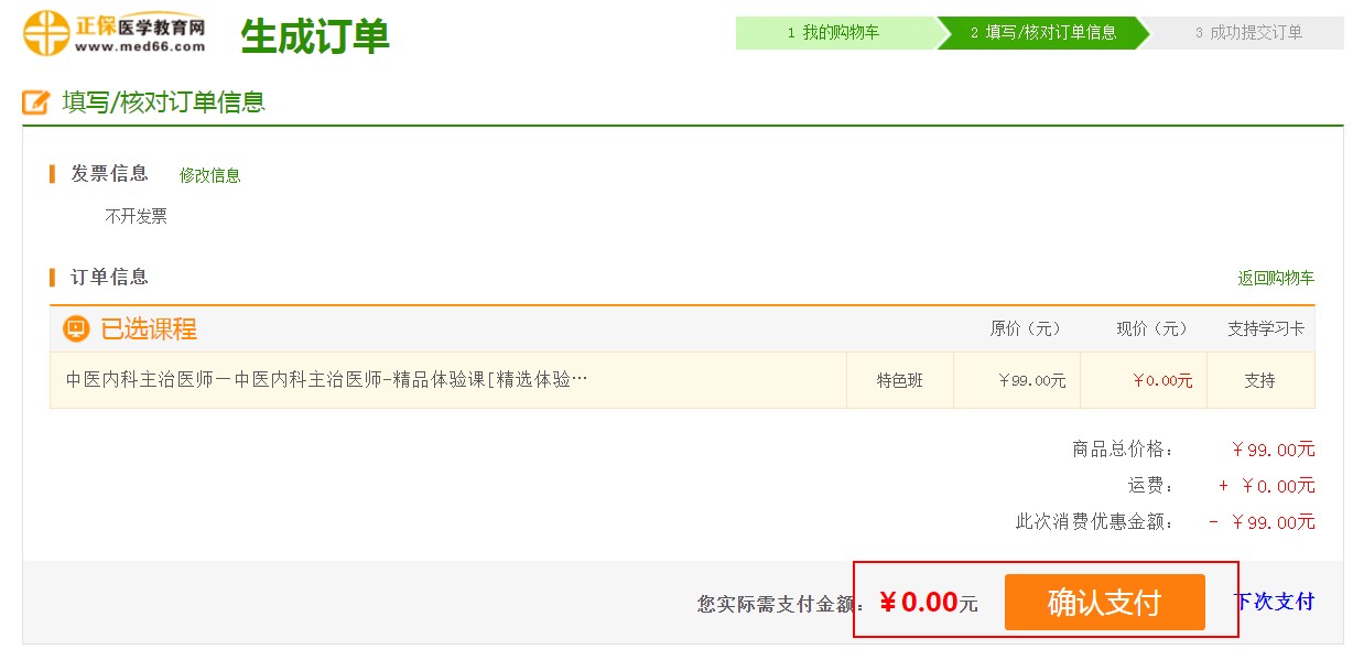 第二步:提交订单,确认支付“0元”;