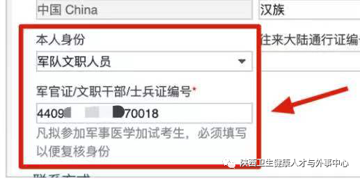 (二)现役军人和部队文职人员报名时,须使用有效的居民身份证进行申报,在网报系统本人身份一栏中选择相应的“军人”身份,并填写相关的军官证、警官证、文职干部证、士兵(官)证和军队学员证等证件号码。