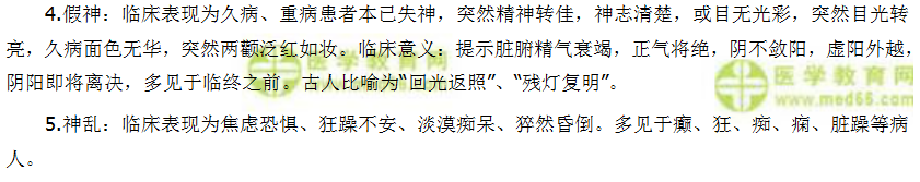 1.【答案及解析】A.假神:临床表现为久病、重病患者本已失神,突然精神转佳,神志清楚,或目无光彩,突然目光转亮,久病面色无华,突然两颧泛红如妆。提示脏腑精气衰竭,古人比喻为“回光返照”、“残灯复明”。