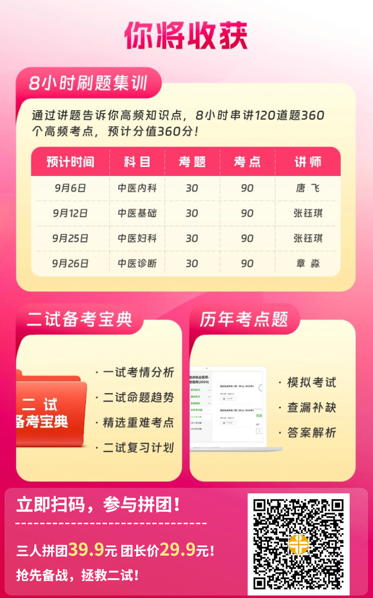 ·隐藏福利!购买《120急救刷题包》的学员,可按8折优惠后补差价升级到原价1380元《二试急救班》!小编只有1个字可以形容这波操作:值!