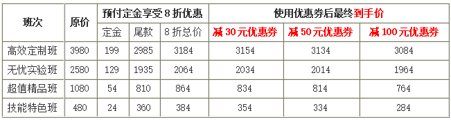 高效定制班:原价是3980元,预付定金享受8折购课优惠后的价格是3184元!