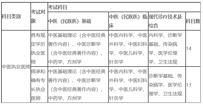 中医类医师资格考试医学综合笔试内容、考试形式以原卫生部医师资格考试委员会审定颁布的《医师资格考试大纲(中医、民族医、中西医结合医师)》为依据。中医执业医师医学综合笔试考试方案及内容见下表: