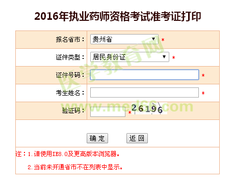 贵州2016年执业药师考试准考证打印入口: