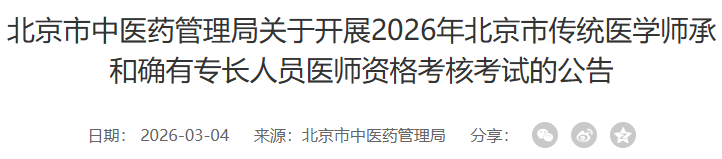 根据《传统医学师承和确有专长人员医师资格考核考试办法》(中华人民共和国卫生部令第52号)及《北京市传统医学师承和确有专长人员考核管理办法》(京中医政字〔2016〕147号)要求,现将2026年北京市传统医学师承和确有专长人员医师资格考核考试工作具体事宜公告如下。