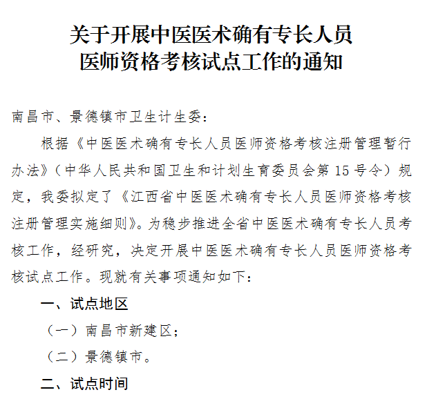 江西省卫计委发布关于开展中医医术确有专长人员医师资格考核试点工作的通知,医学教育网小编为您整理解答如下:
