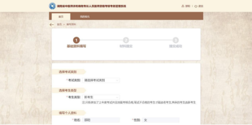 基础资料主要分为四部分信息:选择考试类别、选择考生类型、填写个人资料和证件照片。