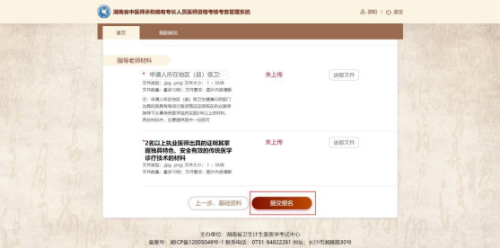 材料上传后,点击界面下方的“提交报名”即可。注意,如需修改基础资料,直接点击页面底部的“上一步,基础资料”按钮即可; 不需修改的话,点击页面底部的“提交报名”按钮,显示提示信息“资料提交成功!请耐心等待审核结果”后,即报名操作流程已全部执行完毕,完成报名。如下图所示: