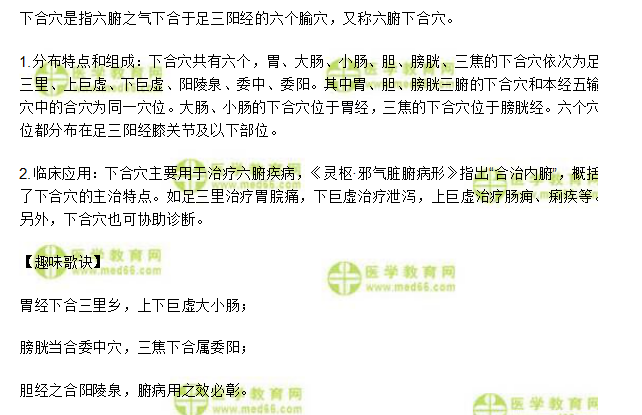 关于“传统师承/确有专长:下合穴的针灸歌诀”相关内容,相信报考传统师承/确有专长考试的考生都想知道,为方便大家了解,在此医学教育网小编为大家整理如下内容: