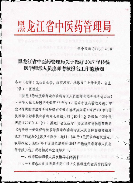 (四)各市卫生计生行政部门请于2017年7月26日前完成市级师承考核报名材料的初审。2017年8月1日前将报名材料和汇总表报送至黑龙江省中医药管理局医政处。