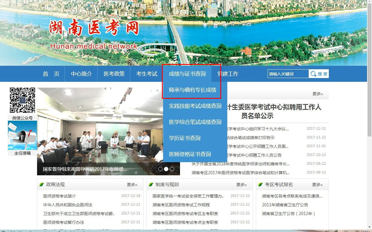 1、点开湖南省医考网,在导航栏中找到成绩证书与查询,选择师承与确有专长成绩。