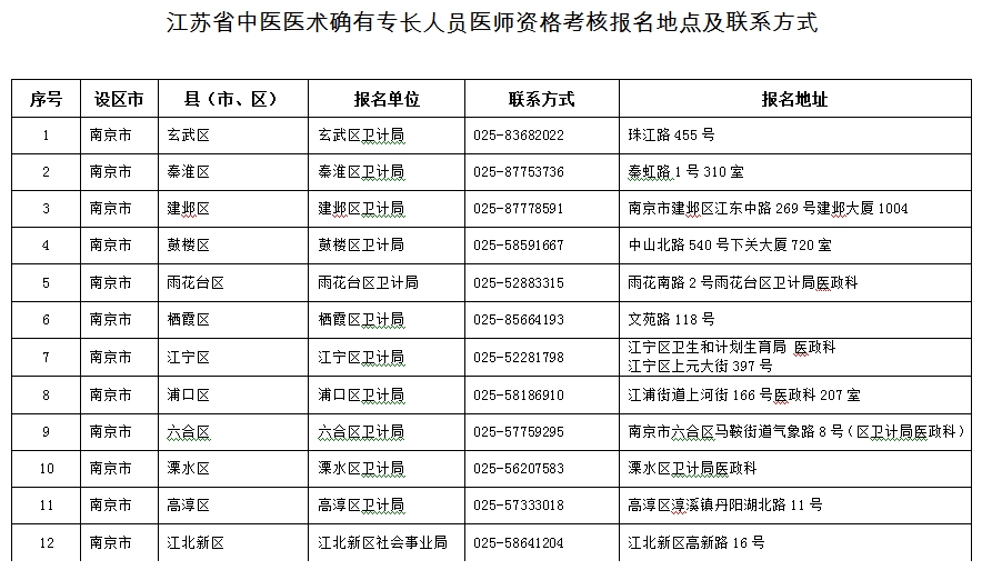 江苏省中医医术确有专长人员医师资格考核报名地点及联系方式