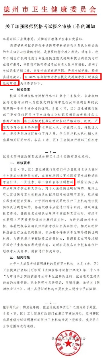 参考2025年医师资格考试报名审核,山东德州考点并没有明确发文要求核查考生社保,但是从以上发文看,山东德州考点2026年医师资格考试报名审核将会更加严格,并补充对于报考考生的社保及工资流水核查。山东省多个考点(青岛|济宁|日照|临沂|东营|烟台|威海)自2025年起已经明确要求审核社保,从德州考点的发文来看,2026年报名申报审核很可能覆盖全省,请准备报考的考生做好相关准备。