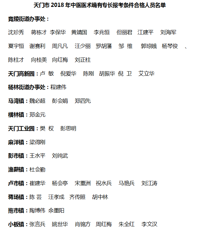 以下为天门市2018年中医医术确有专长报考条件合格人员名单: