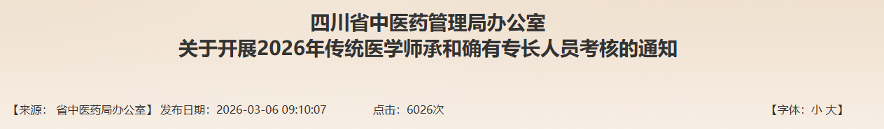 四川省中医药管理局办公室关于开展2026年传统医学师承和确有专长人员考核的通知,医学教育网老师为大家整理总结如下,希望可以帮助到各位: