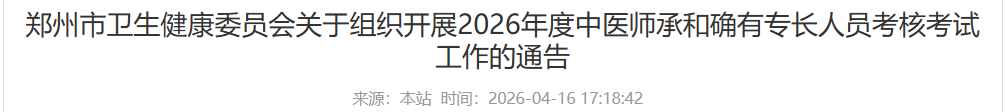 郑州市卫生健康委员会关于组织开展2026年度中医师承和确有专长考核考试工作的通告