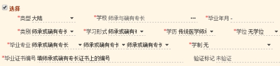 要求毕业学校名称与毕业证书上名称完全一致,工作单位名称和医疗机构执业许可证上名称完全一致,如果选项中查找不到需增补,方法如下: