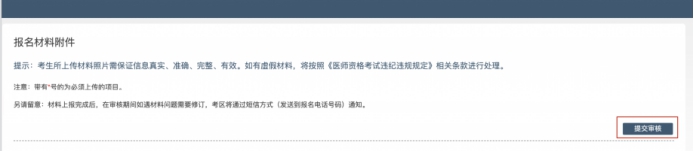 考生根据自己的个人情况,按照考区的通知要求,将所需要的材料图片上传完成后,点击屏幕最右上方的“提交审核”按钮即完成材料的上传。