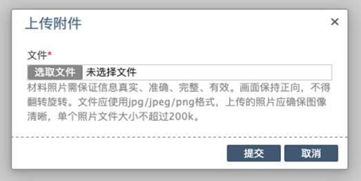 材料照片需保证信息真实、准确、完整、有效。画面保持正向,不得翻转旋转。文件应使用jpg/jpeg/png格式,上传的照片应确保图像清晰,单个照片文件大小不超过200k。