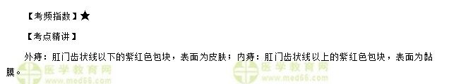 1.【答案及解析】C。外痔:肛门齿状线以下的紫红色包块,表面为皮肤。