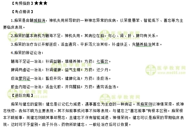 2019年中医执业助理医师考试越来越近,复习时间逐渐紧张,牢记考点、吃透考点需要有计划地复习巩固,为帮助大家更好地复习本部分内容,医学教育网编辑将“中医执业助理医师备考精华考点小结及例题精讲——痴呆”具体资料为大家整理如下: