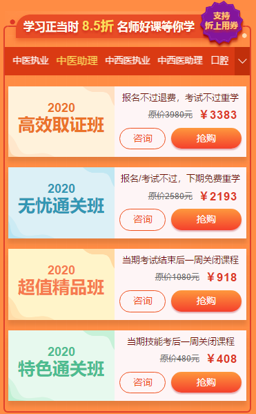 2019年中医执业助理医师成绩公布,也就是说2019年中医执业助理医师考试告一段落,2020年中医执业助理医师考试备考正式开启!同样,医学教育网为大家送来2020年中医执业助理医师的优惠课程,请查收!