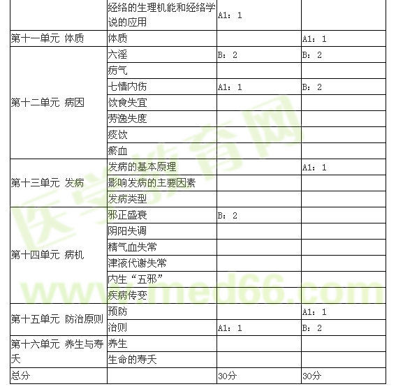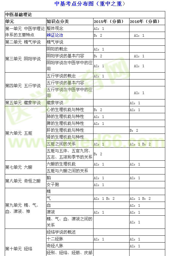 分布:将2015年和2016年考试涉及的内容以表格的形式进行汇总。由图可见每年的考查点是不一样的,所以我们重点学习不是以仿真练习题为主,而是将仿真练习题的题型和出题方向作为参考,重点将教材中涉及的内容灵活运用。据统计,如果认真做了教育网提供的模拟试卷和章节练习,毫不夸张的说中医基础理论达到28分是没有问题的。