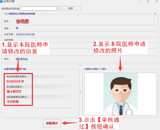 l 及时确认本机构医师个人信息的更新申请。如:任职资格、学历、毕业学校及照片。