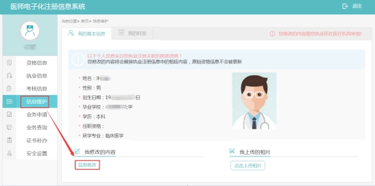 l 此功能模块可修改个人信息,修改信息需执业所在医疗机构审核通过后才能生效。