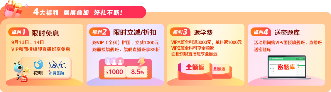 1、限时免息:8月28-31日购买VIP-A/B班(全科)可享18期分期免息,VIP-A/B班(单科)可享受12期分期免息。