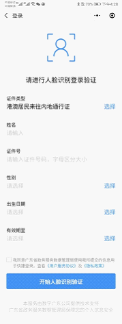 选定“使用人脸识别登录”方式,在证件类型选定“港澳居民来往内地通行证”,填入个人信息,点击同意用户协议,进入“网证CTID”认证个人信息后可选择“反光识别”或“读数识别”刷脸登录。(如图1-3)